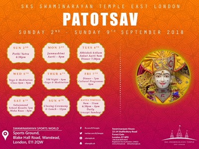 Shree Swaminarayan Temple East London will be celebrating their 31st Patotsav from Monday 3rd September to Sunday 9th September 2018. Abhishek will be performed on Tuesday 4th September followed by Ankoot Darshan.
