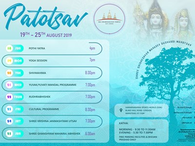 Shree Swaminarayan Temple East London will be celebrating Shree Swaminarayan Temple East London will be celebrating their 32nd Patotsav from Sunday 18th August to Sunday 25th August 2019. This year marks 10 years since Shiv-Parvati murti was installed in our Mandir and as such, this utsav has been marked as the Shree Shideshvar Mahadev Dashabdi Mahotsav!