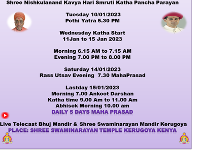 Shree Swaminarayan Temple Kerugoya, Kenya will be celebrating it's 4th Patotsav from Wednesday 11th January to Sunday 15th January 2023. Katha will be narrated by Bhuj Santo who will be reciting the Hari Smruti katha.