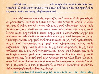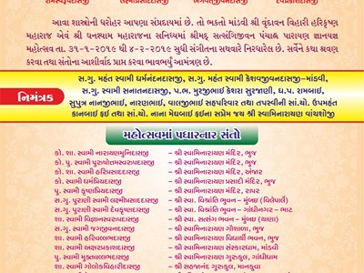 Shreemad Satsangi Jeevan katha will be recited at Mandvi Temple by saints from Bhuj Temple. This scripture composed by Shatanand Swami contains the Lords divine pastimes and will be broadcasted live.
