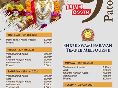 Shree Swaminarayan Temple Melbourne will be celebrating its 9th Patotsav from the 22nd January to the 26th January 2021. The Pothi Yatra will be on the Thursday 21st January 2021. Please see the poster below for more details. The entire event will be broadcasted live on our website, youtube channel and facebook page.