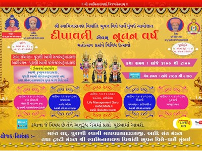 Shree Swaminarayan Vishranti Bhuvan Mumbai Vile Parle has organised a number of events leading up to and until Diwali 2020 from 11th November to 15th November 2020, 6:00pm - 9:00pm IST