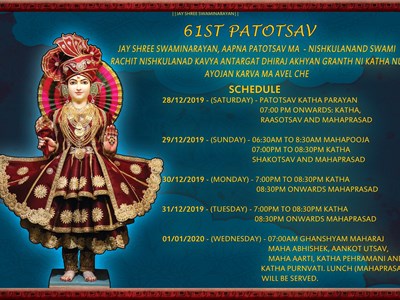 Shree Swaminarayan Temple Tanzania will be celebrating their 61st Patotsav. Learned saints from Bhuj Temple will be present and will recite Dhiraj Akhyan composed by Nishkulanand Swami.
