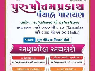 Shree Swaminarayan Temple Tanzania will be celebrating their 62nd Patotsav from Monday 28th December 2020 to Friday 1st January 2021. Katha will be recited by learned saints from Bhuj Mandir.