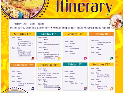 With the Grand Celebration only days away, please save the dates! Join us in welcoming H.H Maharajshree and Santos on Friday 12th July, sing along with our new music album "Aavo Maara Naath", bring your kids along to an extravagant fun fill day at our Swaminarayan Mela, come and enjoy the sight of our Ghanshyam Maharaj bathe in flowers at the Rajoupchaar ceremony. Are you not an early bird? Worry not! Ghanshyam Maharaj's Abhishek will be well worth the early start. Calling all Grandmothers, Mothers, Daughters, Sisters and Wives – Don't miss a ladies only sabha in the presence of H.H Gadiwala Shree and Shreeraja, come along and sing along to the ladies only musical extravaganza. See bhakta Prahlad come to life where our youth bring to you story of Prahlad through an interactive musical. Do you like to dance? Bring your dancing groove and join us for the Maha Raas Utsav. Our beloved Bhuj Mandir Santos will be reciting Shree Bhaktchintamani in the mornings and Hanuman Chalisa Choipai Gaan in the evenings. Our congregation will be blessed with the arrival of H.H Lalji Maharajshree too. Look through our Itinerary as there is so much more planned for this 9 day event!